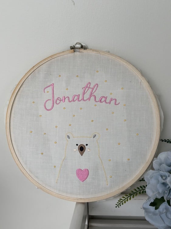 - التصميم: يحمل اسم الطفلة مع رسومات أنيقة مثل الدب الصغير وقلب ملون.