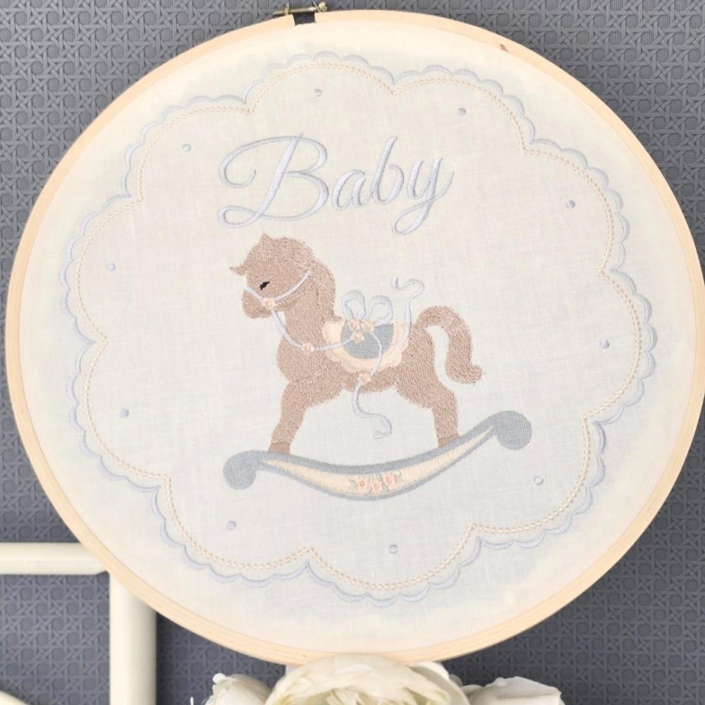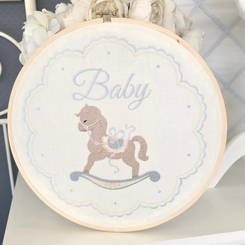 إطار مطرز باسم الطفل بعناية ليخلّد أجمل لحظات المولود، ويمنح الذكرى طابعًا شخصيًا مليئًا بالنعومة والدفء، مناسب للهدايا وبكجات الأمومة.