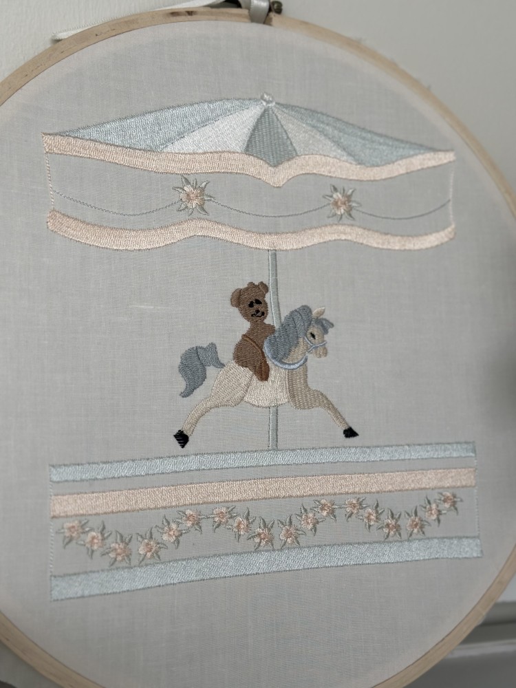 - التصميم: طوق خشبي دائري يحتوي على رسمة حصان ميري-غو-راوند مع دب صغير وزخارف ناعمة.