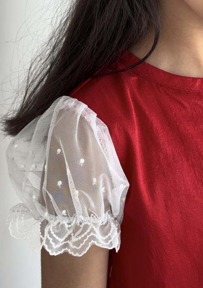 - التصميم: فستان مزخرف بأربطة صغيرة على الصدر وأكمام شفافة مع لمسات من الدانتيل الأبيض.