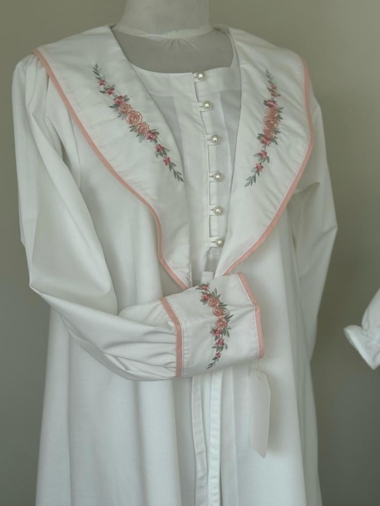 تألقي بأناقة ناعمة مع روب ابيض حرير مطرز بتصميم فاخر يليق بلحظاتك المميزة.
